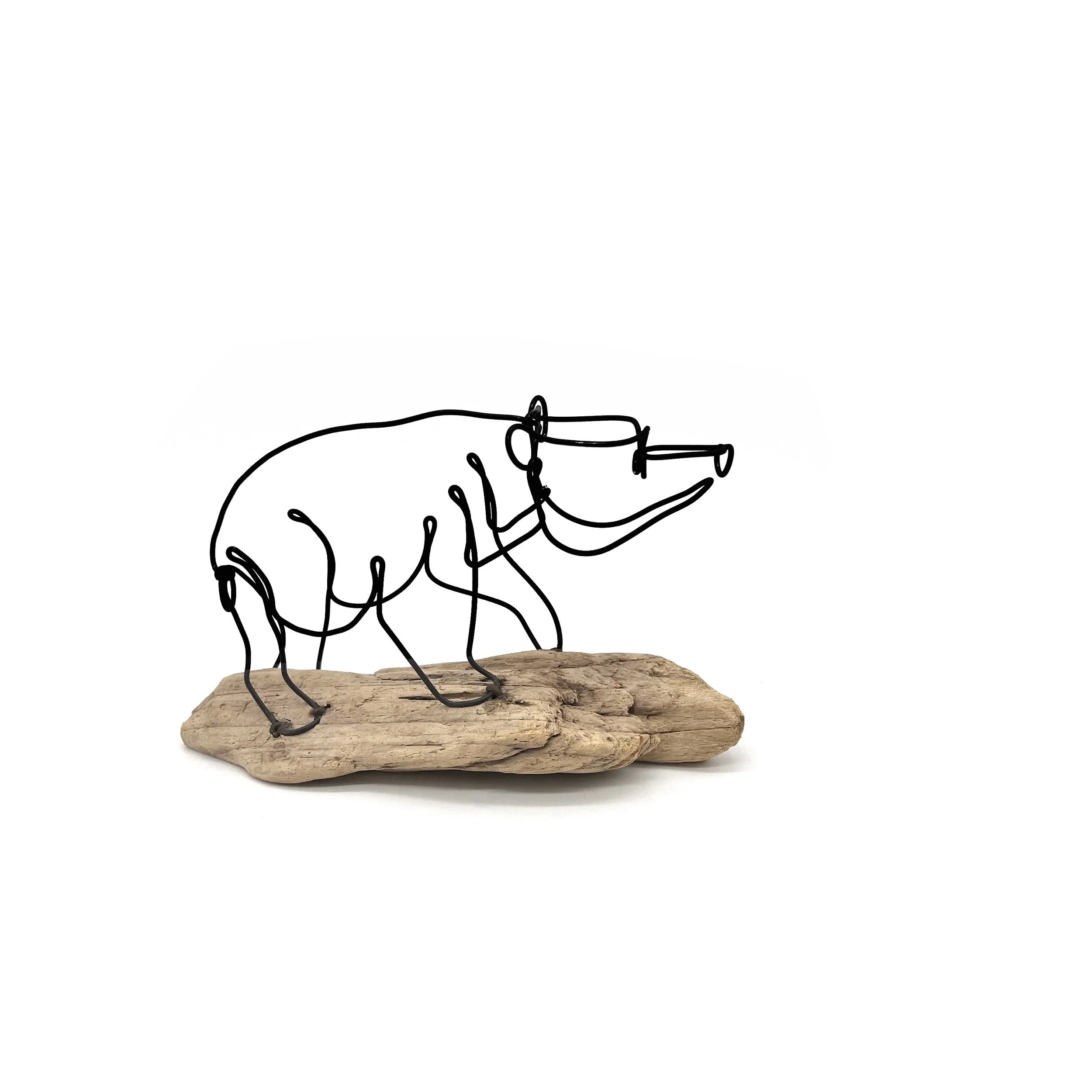This wire bear is created using one strand of 16 steel gauge wire and is attached to the driftwood shown in the photo.
